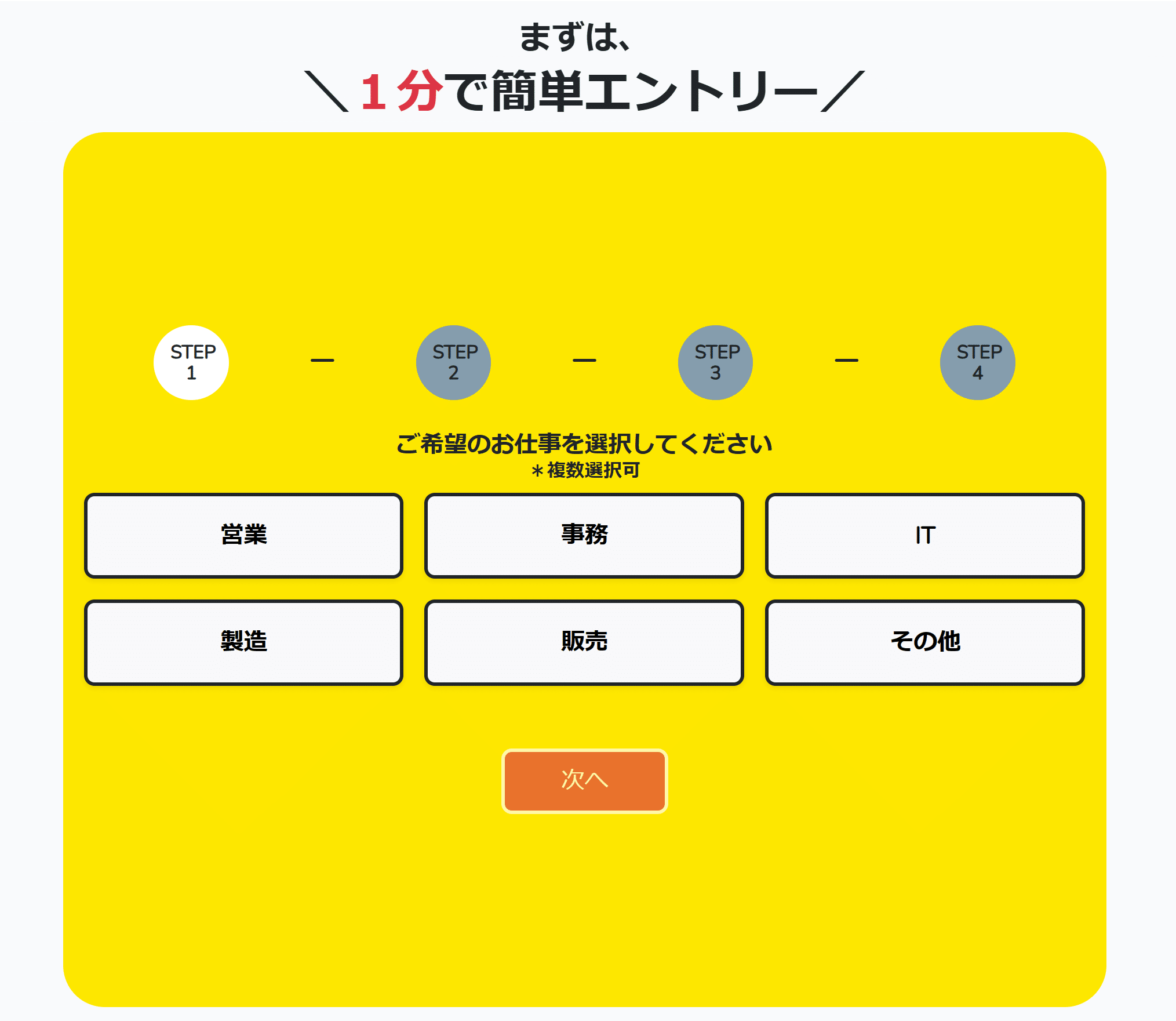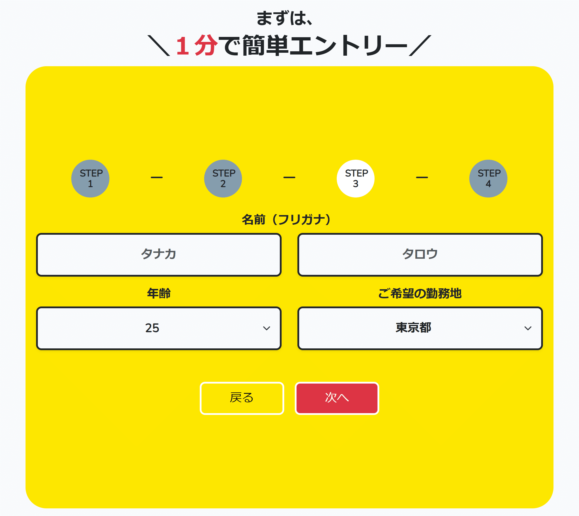 ポチッとJOBは、サイト上にあるエントリーフォームの項目を選んでポチるだけ!入力はSTEP3にある『氏名(カナ)』とSTEP4にある『メールアドレス・電話番号』のみ。わずか1分でエントリー完了!