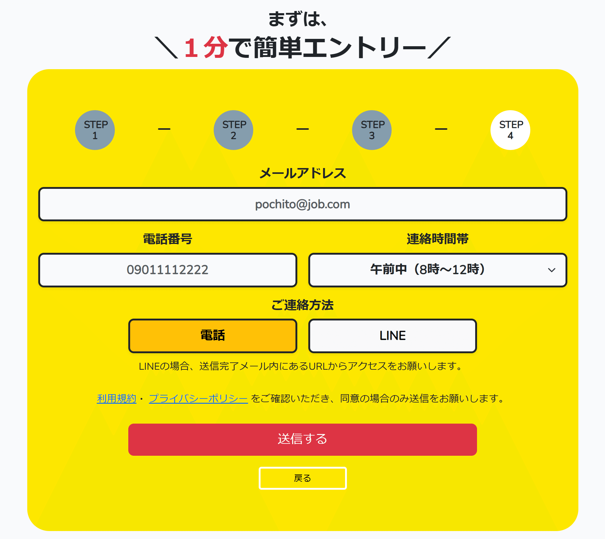 STEP4にあるご連絡方法で、電話またはLINEでの選択が可能となっております。エントリー完了後に、選択された方法により担当エージェントからの連絡が入ります。